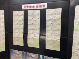 1階から2階に上がる階段のところに掲示しています。